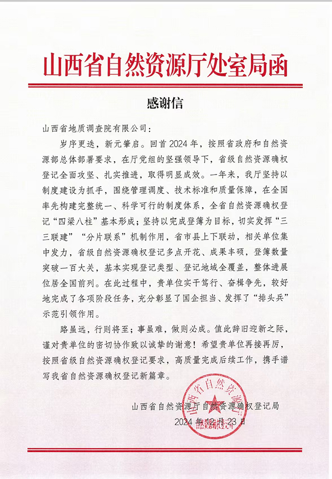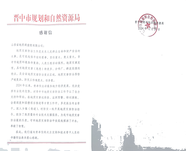 近期,公司收到來自政府、地方以及行業(yè)部門等多方的感謝信,信中均對地調(diào)院有限公司專業(yè)能力、人才實(shí)力與社會責(zé)任感給予了高度贊揚(yáng)。