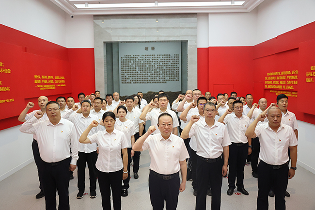 活動(dòng)中,全體黨員干部面向黨旗,莊嚴(yán)舉起右拳,重溫入黨誓詞。鏗鏘有力的誓言在展廳內(nèi)回蕩,既表達(dá)了大家堅(jiān)守清廉本色的堅(jiān)定信念,也彰顯了不忘初心、牢記使命的政治擔(dān)當(dāng)。